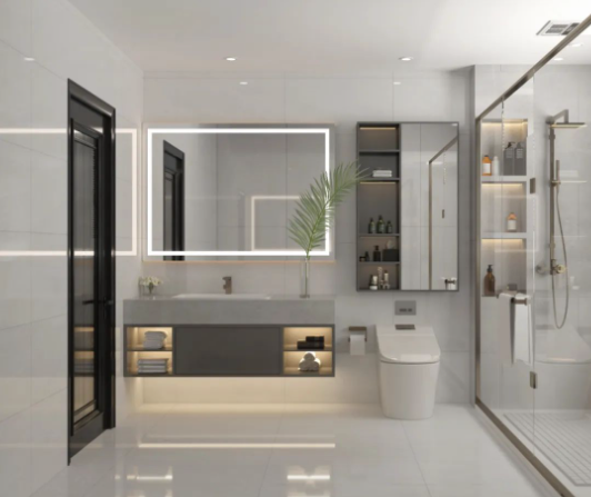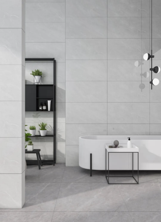 400×800mm戛納灰搭配白色衛浴潔具,方寸間彌漫著輕靈通透的視覺效果,木色元素的融入,自帶溫暖治愈的格調,為空間塑造柔美輕盈的印象。