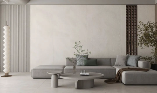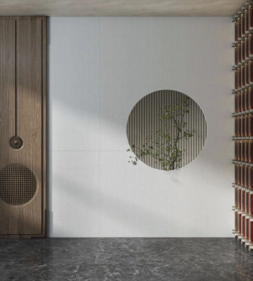墻面選用750X1500mm規格的宋素|凡古磚綺羅香,整體基調偏向淺色系,搭配原木色等主體色,仿佛呼吸著大自然的氣息,領悟塵世喧囂中的靜謐。